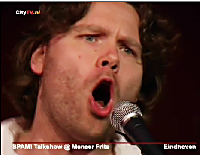 Zo 13 mei 2007 LiveSPAM! talkshow Deze keer met:Porgy Franssen, Schittert op het toneel in 'Wie is er bang voor Virginia Woolf?' en op tv in Keyzer & De Boer Advocaten. Kees Verkade, Beeldhouwer van het beeld van Frits Philips op de markt. Komt speciaal uit Monaco voor enkele kritische kanttekeningen. Wonderen gebeuren! Mireille Kersten, Een jonge psychologe geneest dieren en mensen langs spirituele weg. Kunnen we gerust gaan slapen? Marriet Mittendorff, Wethouder van Veiligheid en Handhaving in Eindhoven. Komt ons geruststellen, nu we in de meest criminele stad van Nederland blijken te wonen. ![]() Muziek Evita van Dam, (13, cello) en Floris van Dam (11, piano) Weer twee muzikale talenten op het SPAM! podium. Sander Blom, Singer/songwriter. Halve finalist in De Grote Prijs van Nederland. |